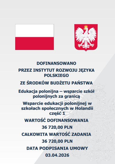 Dofinansowano przez Instytut Rozwoju Języka Polskiego ze środków budżetu państwa w ramach dotacji celowej na podstawie umowy o dofinansowanie z dnia 03.04.2026 r. w ramach wykonania zadania „Wsparcie edukacji polonijnej w szkołach społecznych w Holandii część 1”.